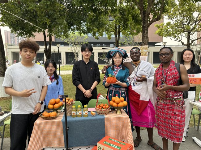活动现场,志愿者们精心布置场地,用心装饰桌椅,制作精美主题展牌,将武鸣沃柑、砂糖橘等新鲜果品整齐摆放,营造出浓郁的助农展示氛围。志愿者们身着特色少数民族服饰,以饱满的热情、生动的语言,向到访的肯尼亚代表团及全校师生,详细介绍“戎归桑梓·果香传情—武鸣老兵果农电商帮扶”志愿服务项目,细致讲解武鸣沃柑的品质特色与助农帮扶成效。